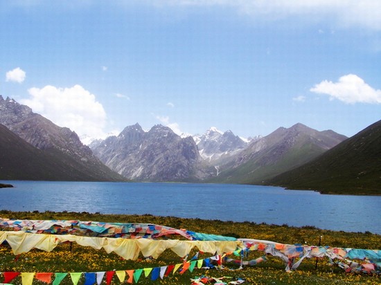 茂密的森林与山、水、奇石、飞瀑……阿科里的“情人海”如同一面湛蓝的镜子,静静地躺在雪山密林当中,林间和草甸上野花绽放,静谧中偶尔会传来一两声牛羊的叫声,美丽的风光让人流忘返。在海子的四周还矗立着各色经幡扎制起来的巨大经塔,风轻轻吹过,翻阅着经幡上一个个美丽传说,也为有情人带来幸福的祈祷。
